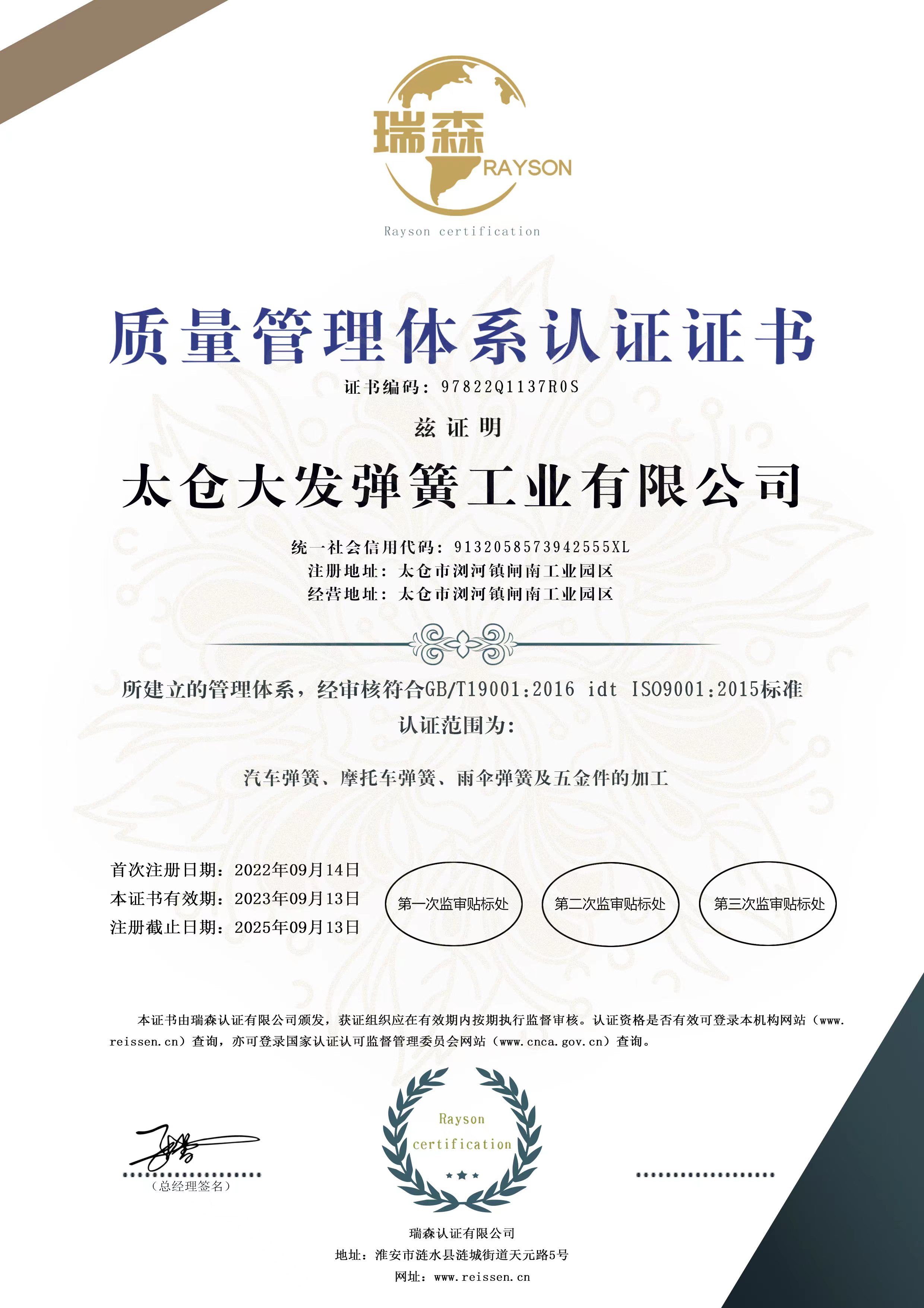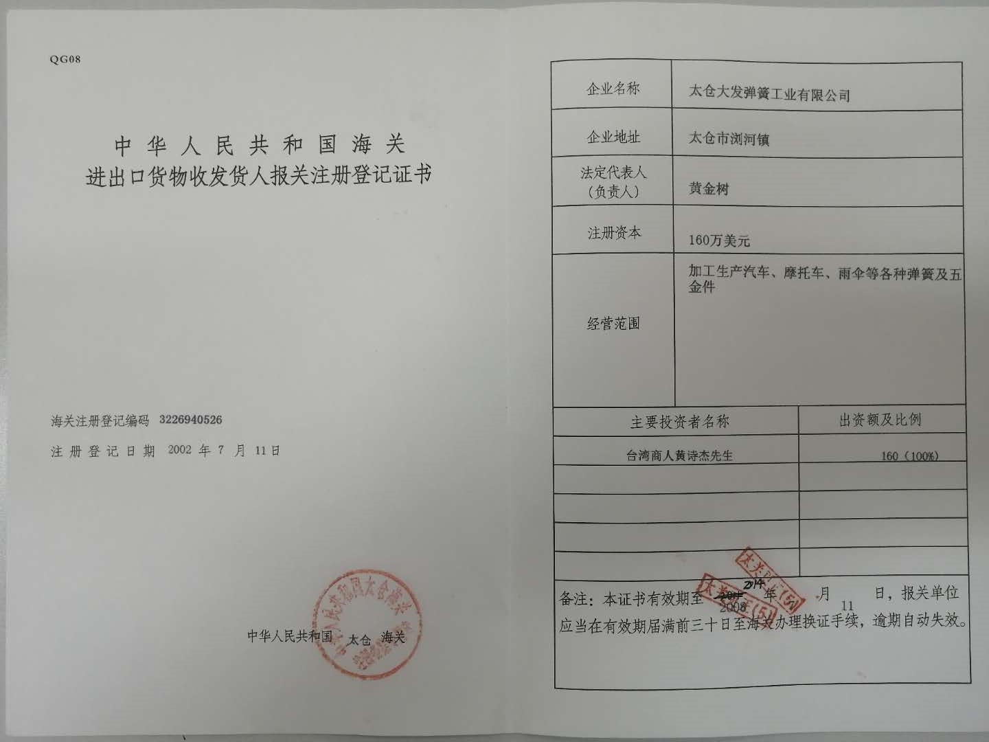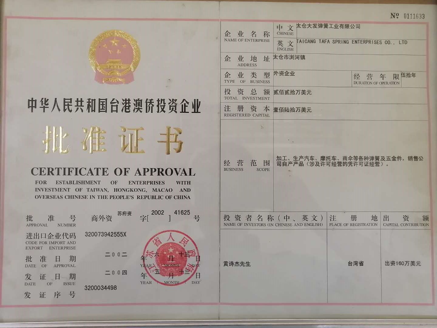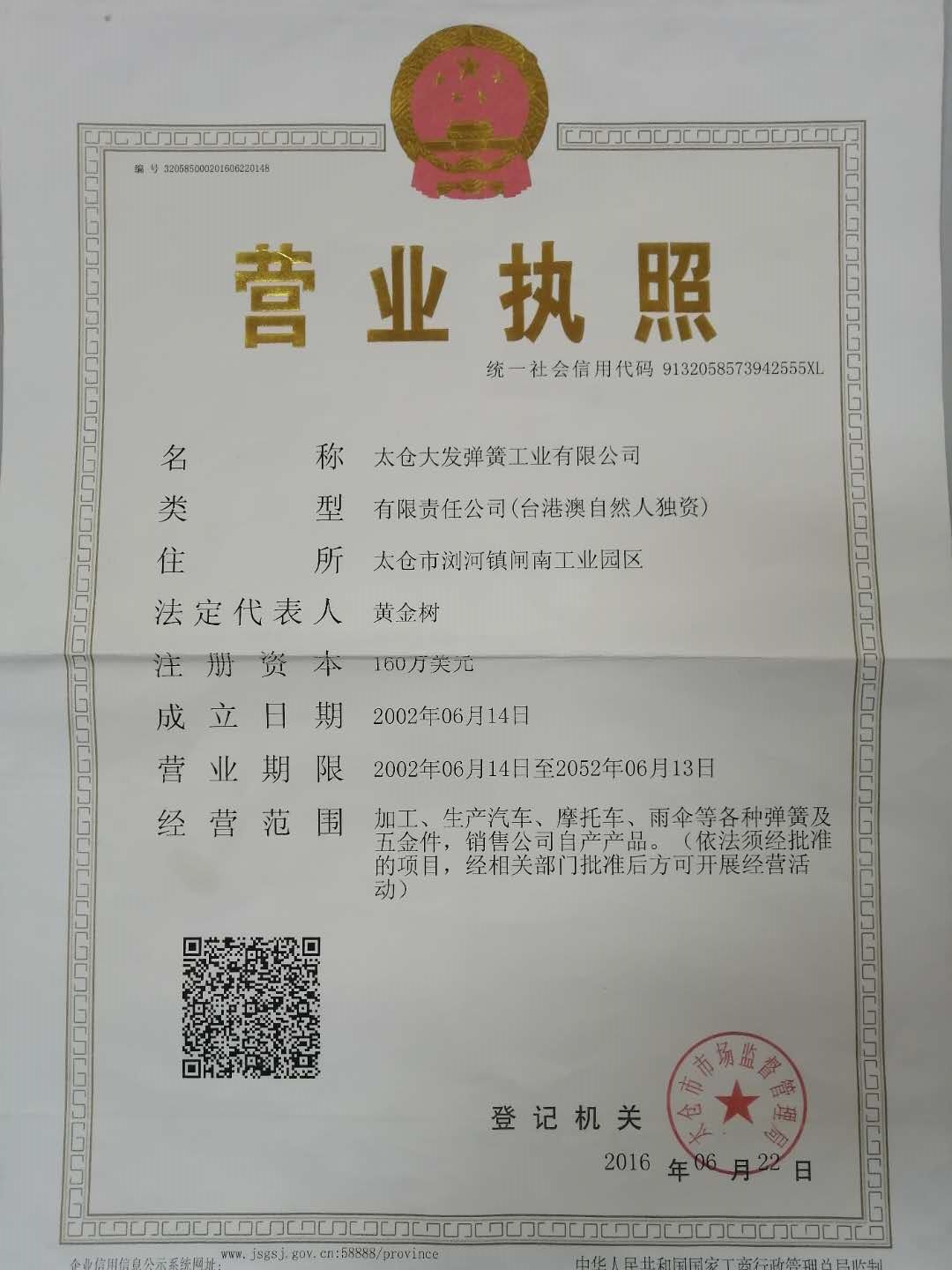 太倉大發(fā)彈簧工業(yè)有限公司由黃金樹先生于1967年始創(chuàng)于臺灣,是一個集雨傘、電子、五金機械、自行車、摩托車、汽車等的彈簧配件生產、加工、輔助設計服務的綜合性企業(yè),其中1990年創(chuàng)辦的廈門大發(fā)彈簧公司、2000年創(chuàng)辦的深圳大發(fā)彈簧公司、2002年創(chuàng)辦的太倉大發(fā)彈簧公司均位于經濟發(fā)展地區,地理位置佳。我們憑借在彈簧制造業(yè)的多年豐富知識與技術,并著眼于以客戶為導向,秉持“以人為本,以質為先,以客為主,持續(xù)創(chuàng)新”的經營理念,強化競爭優(yōu)勢。公司導入ISO9001: 2000質量管理體系,執(zhí)行ISO14000:2000管理方式,倡導安全、高質量、高素質的生產。